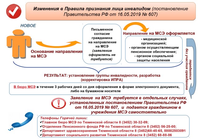 Постановлением Правительства РФ от 16.05.2019 № 607 «О внесении изменений в Правила признания лица инвалидом» упрощен порядок направления граждан на медико-социальную экспертизу и проведения медико-социальной экспертизы.