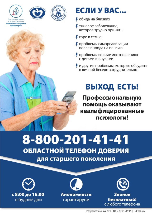С марта 2019 года в рамках реализации регионального проекта «Старшее поколение» национального проекта «Демография» старшее поколение региона может получить психологическую помощь по областному телефону доверия 8-800-201-41-41. За пять месяцев на телефон, который работает на базе Областного геронтологического центра, поступило около 300 обращений.