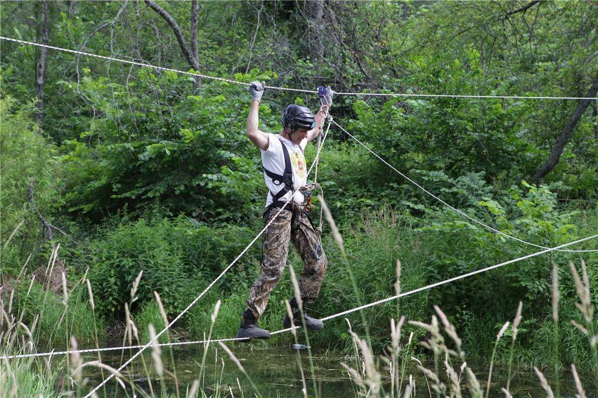Пешеходная трасса получилась на загляденье красивой. Канаты, переброшенные через реку, так и манили переправиться по ним на другой берег. Эта трасса сложностью класса А: участник стартует с участка параллельных перил, перебирается на другой берег, выстегивается, спрыгивает, переходит по берегу до навесной переправы, поднимается либо по лестнице, либо с помощью полиспаста осуществляет горизонтальное движение по перилам с помощью рук и ног, возвращается на берег, перестегивает страховку и спускается по вертикальным перилам на землю. Сложность составляет моменты пристёгивания страховки – здесь нужна сила и ловкость.