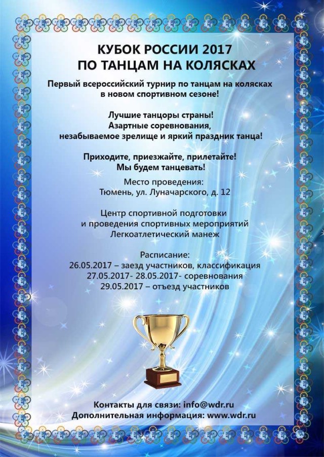 27 мая в 12 часов в городе впервые пройдёт Открытый Кубок России по спортивным танцам на колясках. Место проведения – Легкоатлетический манеж (Тюмень, Луначарского, 12).