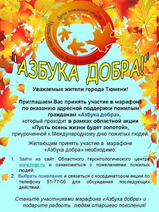 Областной геронтологический центр и Тюменский региональный благотворительный фонд «Старшее поколение» объявляют о начале ежегодного марафона «Азбука добра», который, как и прежде, будет длиться месяц - с 15 сентября по 15 октября 2017 года в рамках областной акции «Пусть осень жизни будет золотой!», приуроченной к Международному дню пожилых людей.