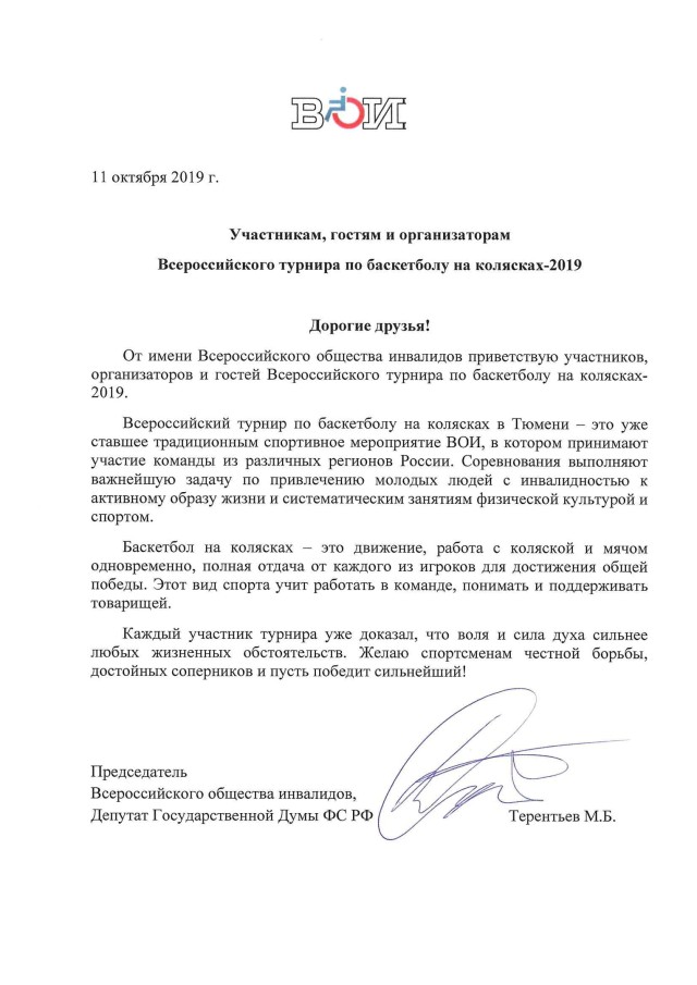 Приветственное слово Михаила Борисовича Терентьева, председателя Всероссийского общества инвалидов, депутата Государственной Думы ФС РФ участникам, гостям и организаторам Всероссийского турнира по баскетболу на колясках в Тюмени.