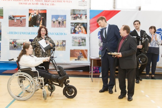 В торжественной обстановке Федерации спорта лиц с ПОДА Дмитрием Новицким было передано электроприводное оборудование для инвалидных колясок. Чудо техники даже удалось протестировать в спортивном зале. Также депутат Думы вручил букет цветов единственной девушке игровых баталий Александре Ложкиной.
