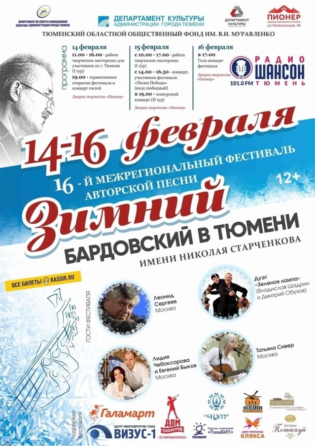 С 14 по 16 февраля в Тюмени пройдет 16-й Межрегиональный фестиваль «Зимний бардовский в Тюмени» им. Николая Старченкова. Местом проведения вновь станет ДТиС «Пионер» (ул. Челюскинцев, 46).