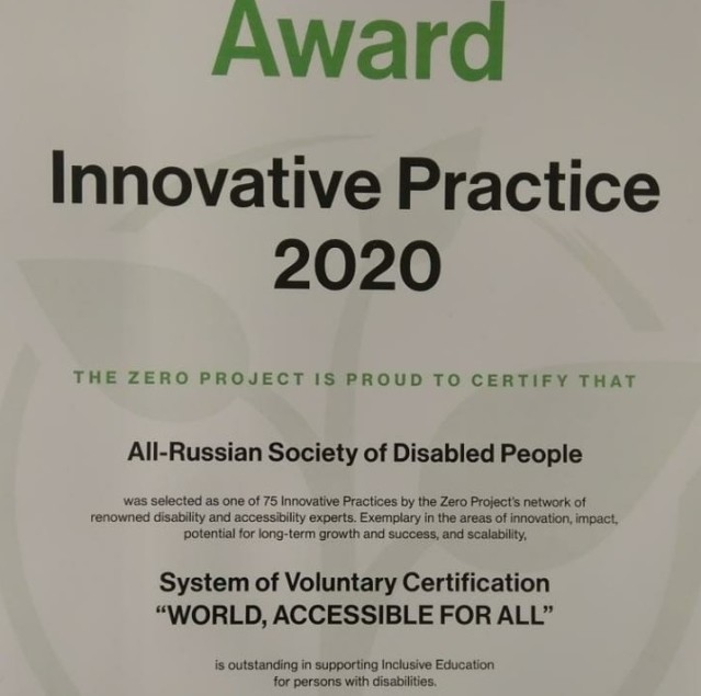 На участие в Zero Project-2020 было подано более 460 проектов из 106 стран, которые демонстрируют инновации, позволяющие молодым людям с инвалидностью получить доступ к возможностям всестороннего образования - от дошкольного до профессионального. Лауреатами стали 75 инновационных практик и 11 инновационных политик из 56 стран. В их числе российский проект «Система добровольной сертификации ВОИ «МИР, ДОСТУПНЫЙ ДЛЯ ВСЕХ».