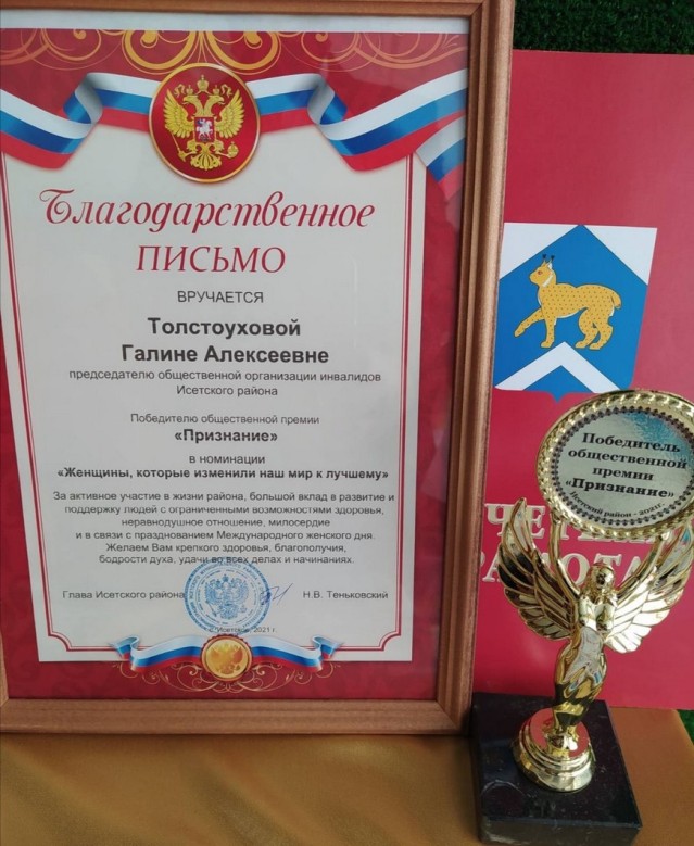 Председатель общественной организации инвалидов Исетского района Галина Алексеевна Толстоухова награждена Благодарсвенным письмом главы Исетского района за победу в общественной Премии "Признание" в номинации "Женщины, которые изменили наш мир к лучшему", а также за активное участие в жизни района, большой вклад в развитие и поддержку людей с ограниченными возможностями здоровья, неравнодушное отношение, милосердие.