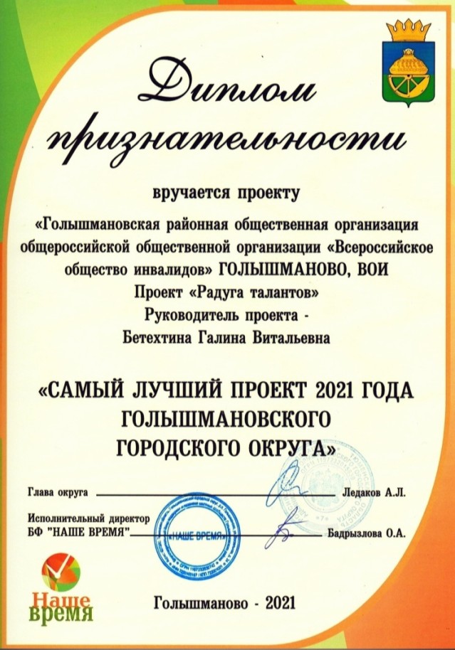 По результатам 2021 года он стал лучшим проектом Голышмановского городского округа! Руководителю проекта Галине Витальевне Бетехтиной, заместителю председателя ГООО ВОИ, вручили Диплом признательности и кубок, подписанный главой округа Александром Ледаковым и директором благотворительного фонда "Наше время" Ольгой Бадрызловой.