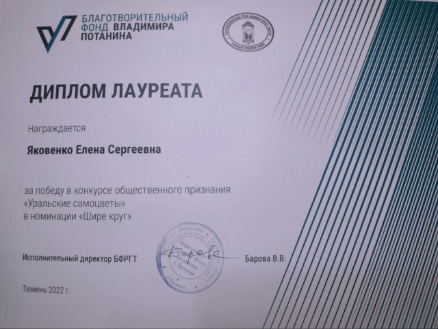 В рамках конкурса общественного признания "Уральские самоцветы" Елена Сергеевна удостоена Диплома лауреата в номинации "Шире круг".