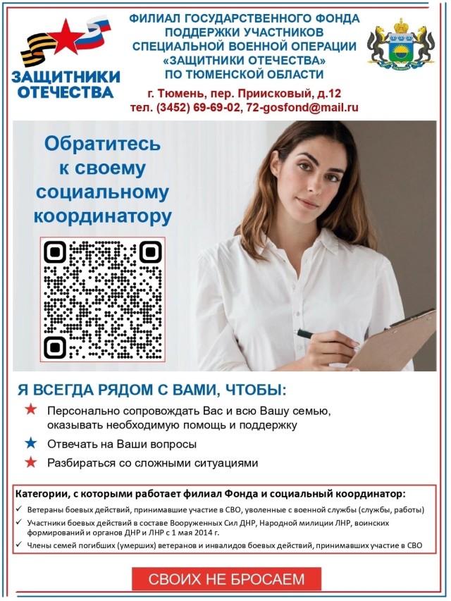 Фонд "Защитники Отечества" в регионах РФ, в том числе и Тюменской области, создан по поручению Президента России Владимира Путина. Основной целью фонда является персональное социальное сопровождение ветеранов СВО, семей погибших и скончавшихся от ранений бойцов.