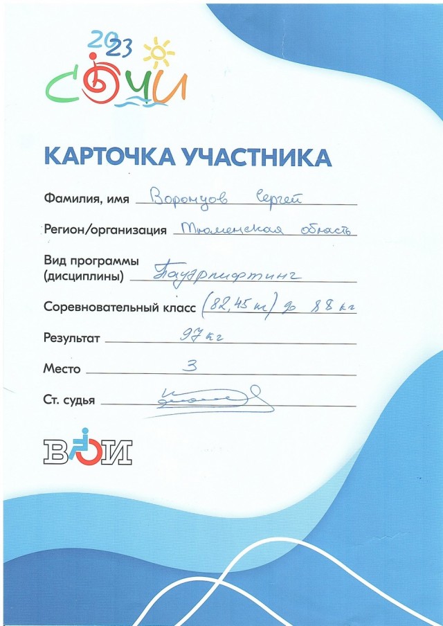 Тюменскую делегацию на физкультурно-спортивом фестивале в Сочи представили председатель Тюменской областной организации ВОИ Евгений Кравченко, а также Татьяна Мозгунова, Ольга Елынина, Сергей Воронцов, Анна Плотникова, Руслан Тарасов, Анжелика Лукина.