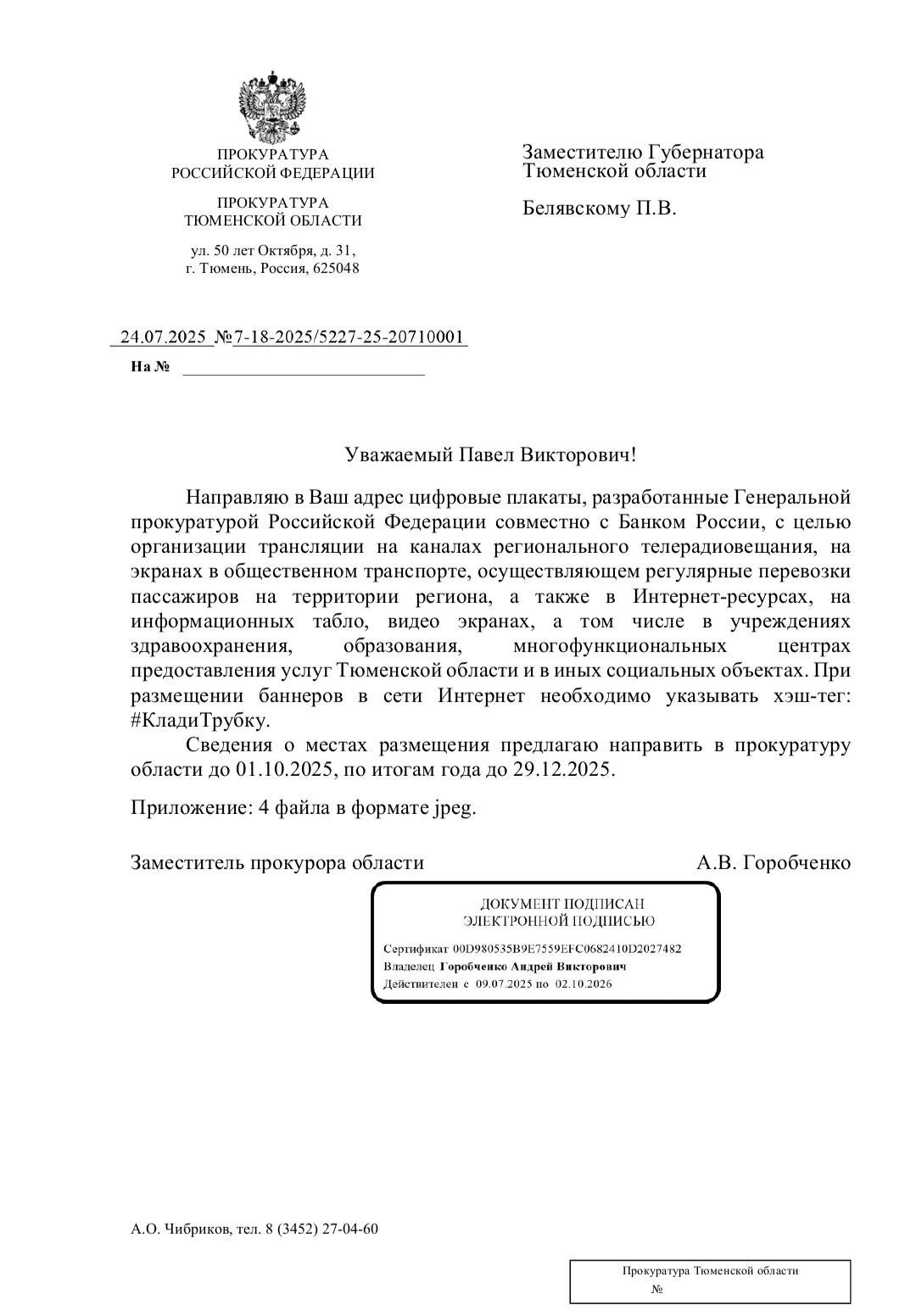 Генеральная Прокуратурой Российской Федерации совместно с Банком России разработала специальные баннеры с предупреждающей информацией с целью организации трансляции на каналах регионального телерадиовещания, на экранах в общественном транспорте, осуществляющем регулярные перевозки пассажиров на территории региона, а также в Интернет-ресурсах, на информационных табло, видео экранах, в том числе в учреждениях здравоохранения, образования, многофункциональных центрах предоставления услуг Тюменской области и в иных социальных объектах.