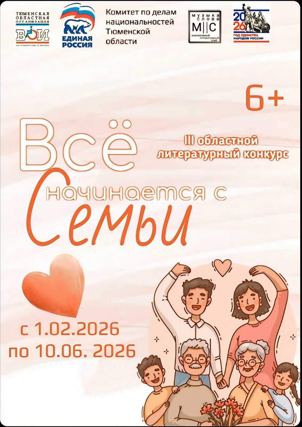 Тюменская областная организация ВОИ и Инклюзивный литературный клуб "Музыка слова" (структурное подразделение ТООО ВОИ) при поддержке регионального отделения партии "Единая Россия" и Штаба общественной поддержки "Единой России" в Тюменской области проводят III областной литературный конкурс "Всё начинается с СЕМЬИ".